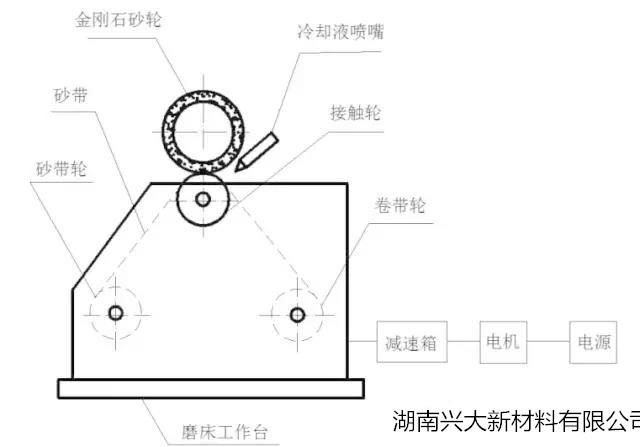 軟彈性修整法在修整時砂帶套在砂帶輪上,修整時金剛石砂輪高速旋轉,卷帶輪緩慢轉動,砂帶在帶輪上慢慢移動,利用砂帶與砂輪的接觸力有效地去除金剛石砂輪表面磨粒間的結合劑,從而達到修整的目的。